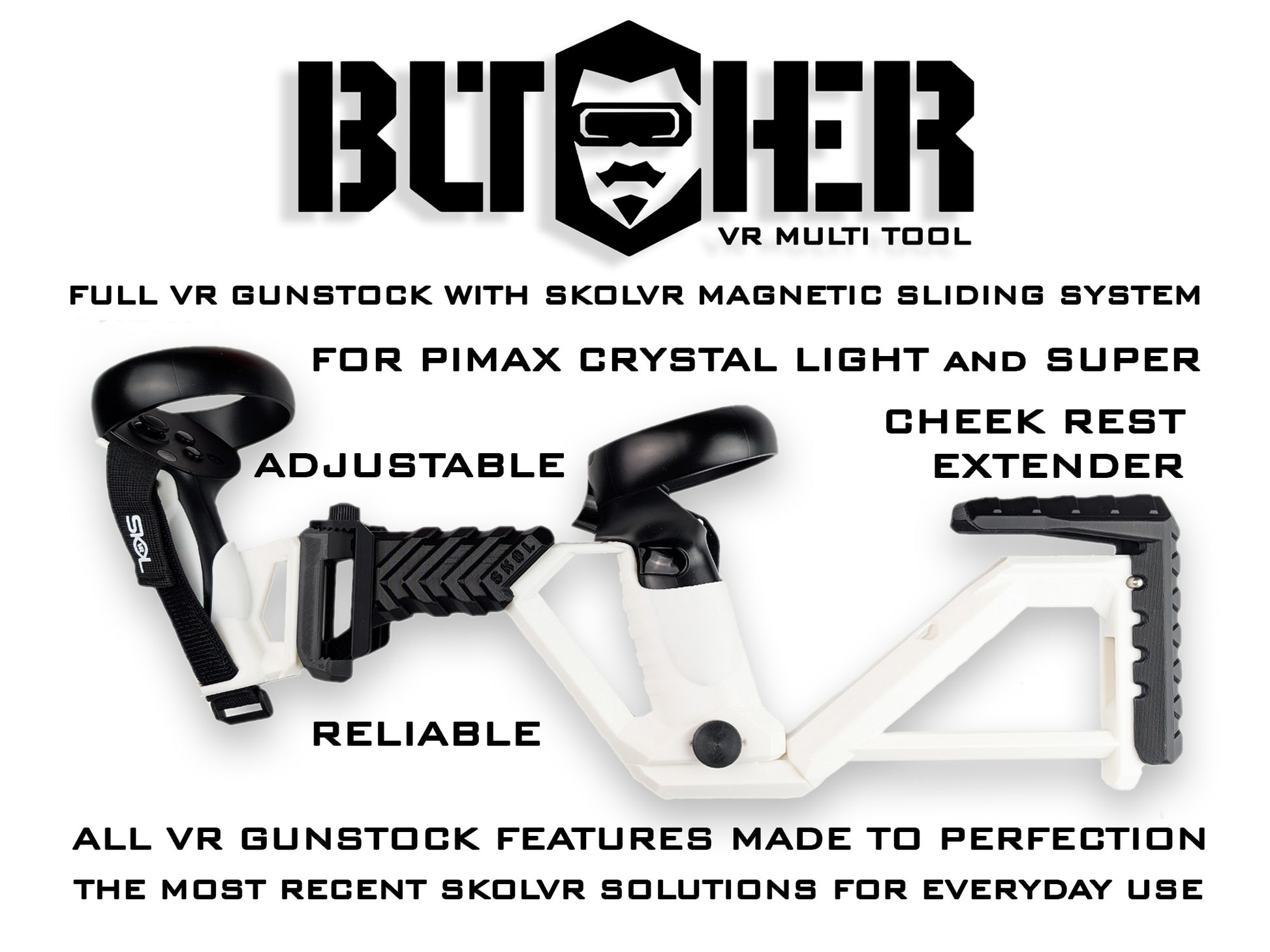 6. Crosse de boucher avec rallonge/appui-joue. Un Norme tactique/militaire polyvalente, extensible à la volée. Simple et efficace. 25 cm (9,5 pouces), distance précise pour une visée confortable avec un viseur de réalité virtuelle. Utilisez-le sans extension pour une mobilité maximale. Ajoutez un appui-joue/extension avec rainures spéciales pour un confort optimal. Au besoin, ajoutez le système de glissière magnétique SKOLVR pour équilibrer le poids sur vos poignets, à la manière d'un poing américain high-tech.